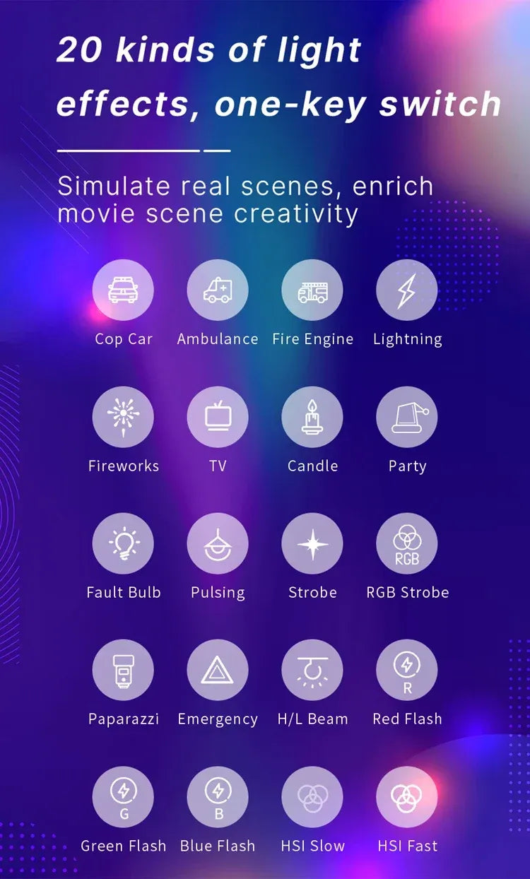 Creative Lighting Effects: Includes built-in modes such as strobe, flash, and color cycle—ideal for adding visual flair to your content.